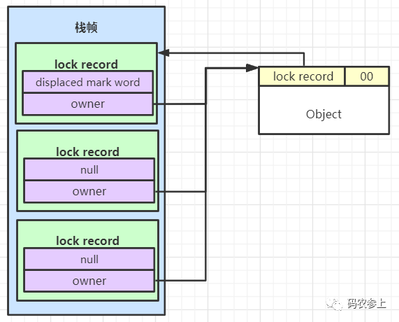 我们知道,synchronized是可以锁重入的,在轻量级锁的情况下重入也是依赖于栈上的lock record完成的。以下面的代码中3次锁重入为例: