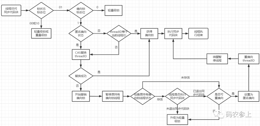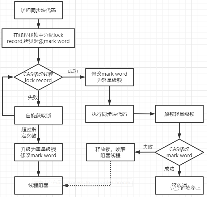 在上面分析的基础上,再加上我们上一篇中讲到的轻量级锁升级到重量级锁的知识,就可以对上面的流程图进行完善了: