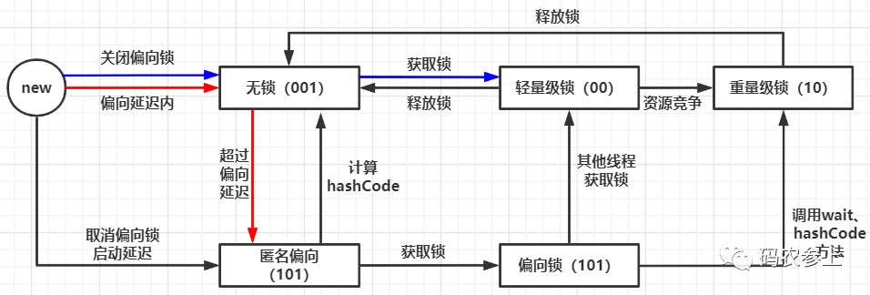 额外注意一点就是匿名偏向状态下,如果调用系统的hashCode()方法,会使对象回到无锁态,并在markword中写入hashCode。并且在这个状态下,如果有线程尝试获取锁,会直接从无锁升级到轻量级锁,不会再升级为偏向锁。