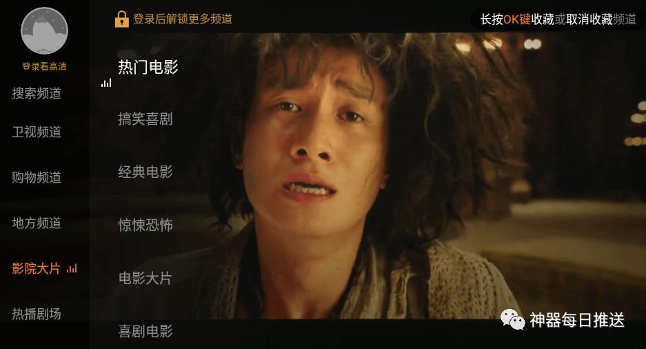 1、这款电视直播工具的操作比较怪异,需要使用电视遥控来操作,长按OK键可以收藏自己喜欢的电视频道,同时也可以展开电视频道菜单和用户登录界面(这一点非常不方便);