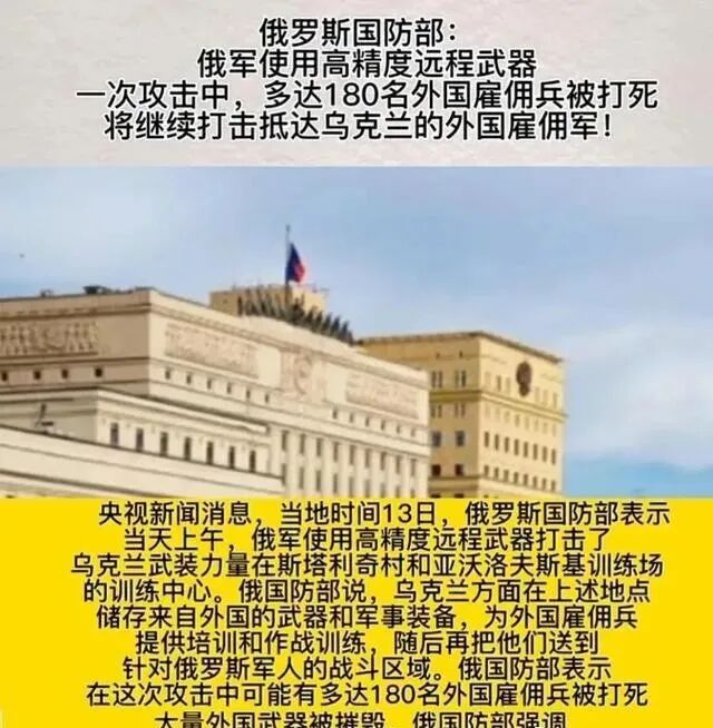 据俄罗斯国防部消息称:俄军使用高精度远程武器一次攻击中,一次把180多名的外国雇佣军一窝端了,那日本的75个雇佣军估计在里面灰都找不到了!
