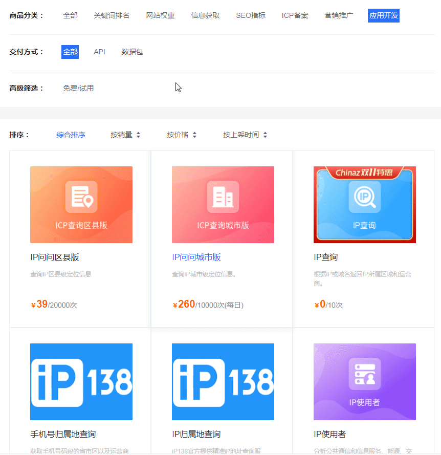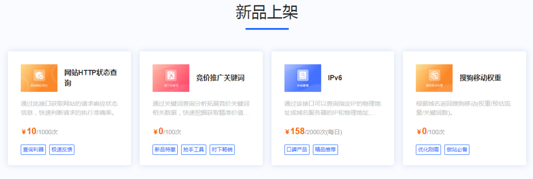 平台拥有丰富多样的API资源,商品品类包括了关键词排名、网站权重、SEO指标、关键词指数、ICP备案、营销推广、IP应用开发、竞价类接口等。大家可以利用这些接口快速实现网站权重、关键词排名、域名备案信息、Whois查询、违禁词查询等数据查询。