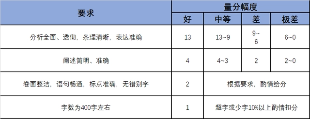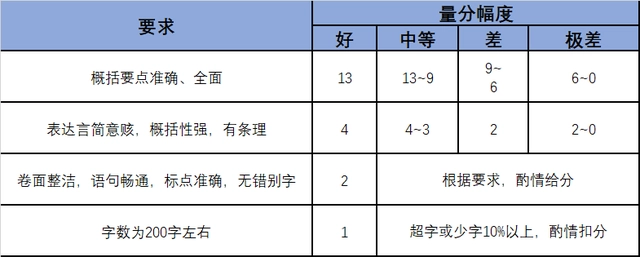 一般来说,概括题、分析题、提出对策题的评分标准集中在两个方面:一是要切合“参考要点”,二是对语言表达和试卷的整洁、句子的通顺、标点符号的使用、字迹的明晰、错别字和字数的数量。
