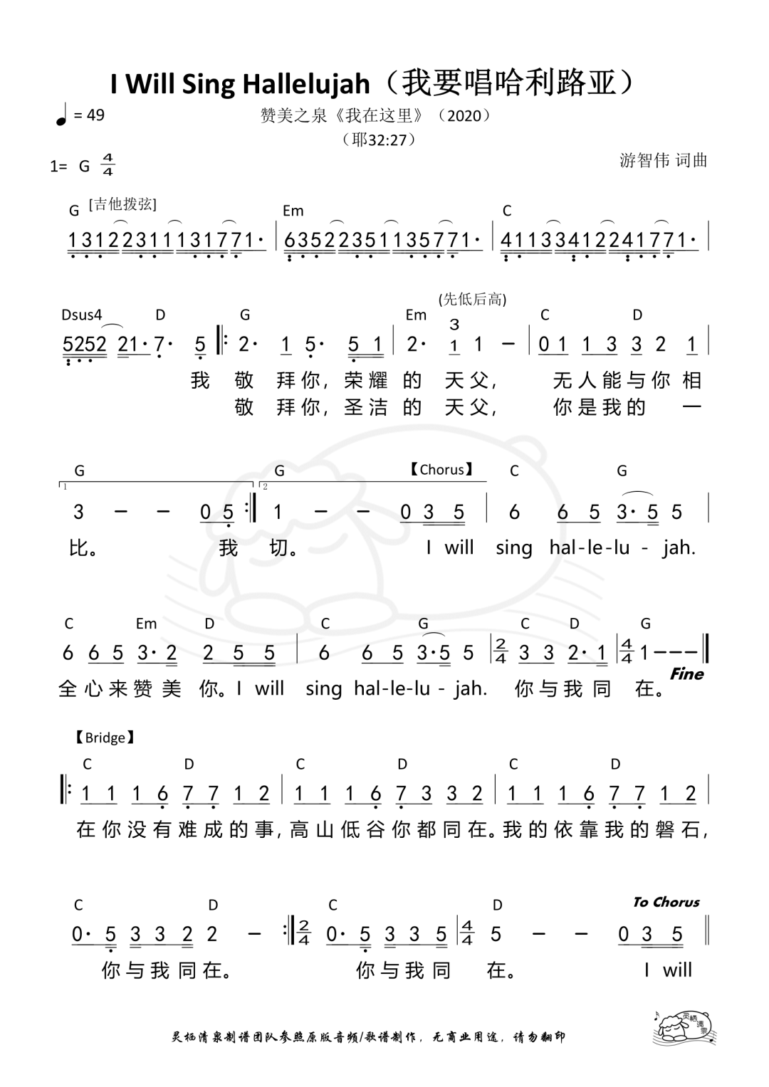 I Will Sing Hallelujah [我要唱哈利路亚] 词、曲:游智伟 David Yu © 2020 Stream of Praise Music / BMI. CCLI: 7150664 [Verse] 我敬拜你 荣耀的天父 无人能与你相比 我敬拜你 圣洁的天父 你是我的一切 [Chorus] I will sing hallelujah. 全心来赞美你 I will sing hallelujah. 你与我同在 [Bridge] 在你没有难成的事 高山低谷你都同在 我的依靠我的磐石 你与我同在 在你没有难成的事 高山低谷你都同在 我的依靠我的磐石 你与我同在 你与我同在