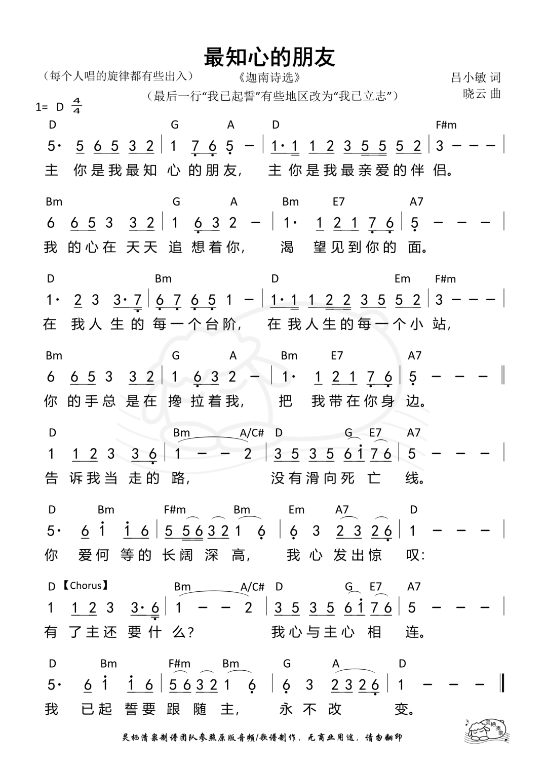 +- 首页 祝瑞莲 正文 音频播放地址: 视频播放地址: 主 你是我最知心的朋友 主 你是我最亲爱的伴侣 我的心在天天追想著你 渴望见到你的面 在我人生的每一个台阶 在我人生的每一个小站 您的手总是在搀拉著我 把我带在你身边 告诉我当走的路 没有滑向死亡线 你爱何等的长阔深高 我心发出惊叹 有了主还要什麽 我心与主心相连 我已起誓要跟随主 永不改变 歌谱: 赞美诗歌未整理以斯拉盛晓玫祝瑞莲生命河灵粮堂小羊诗歌Jesus Image天韵合唱团新酒使命团我心旋律JLSS BlessedThe Hope佳音 收藏 分享 链接