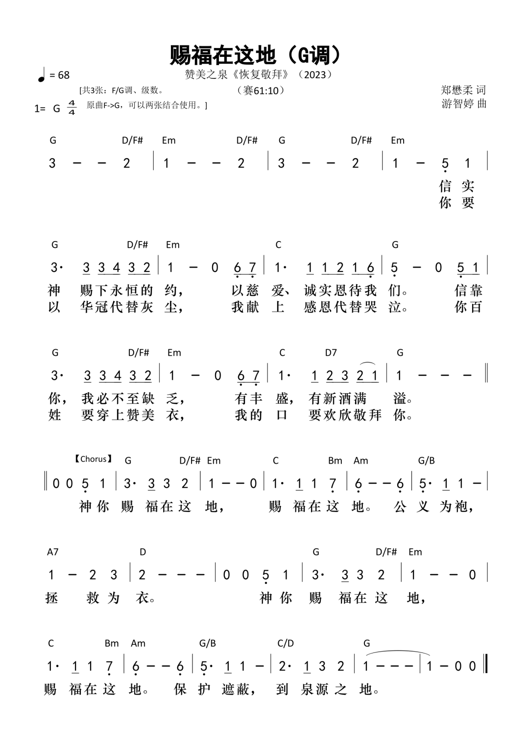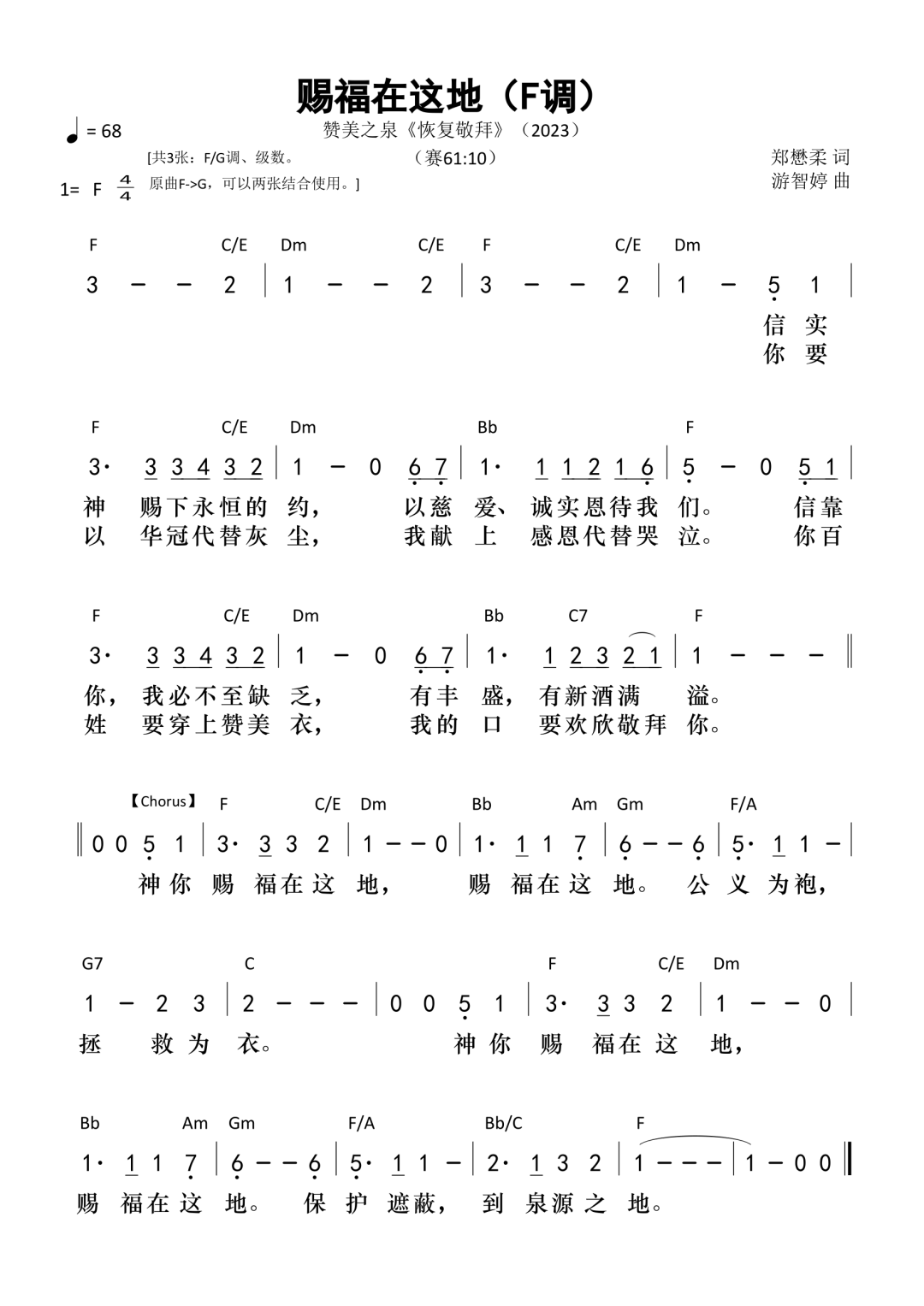赐福在这地 Send Thy Blessing On This Land 词:郑懋柔 Tiffany M. Cheng 曲:游智婷 Sandy Yu © 2023 Stream of Praise Music / BMI. CCLI #7218251 [Verse 1] 信实神赐下永恒的约 以慈爱 诚实恩待我们 信靠你 我必不致缺乏 有丰盛 有新酒满溢 [Verse 2] 你要以华冠代替灰尘 我献上感恩代替哭泣 你百姓要穿上赞美衣 我的口要欢欣敬拜你 [Chorus] 神你赐福在这地 赐福在这地 公义为袍 拯救为衣 神你赐福在这地 赐福在这地 保护 遮蔽 到泉源之地