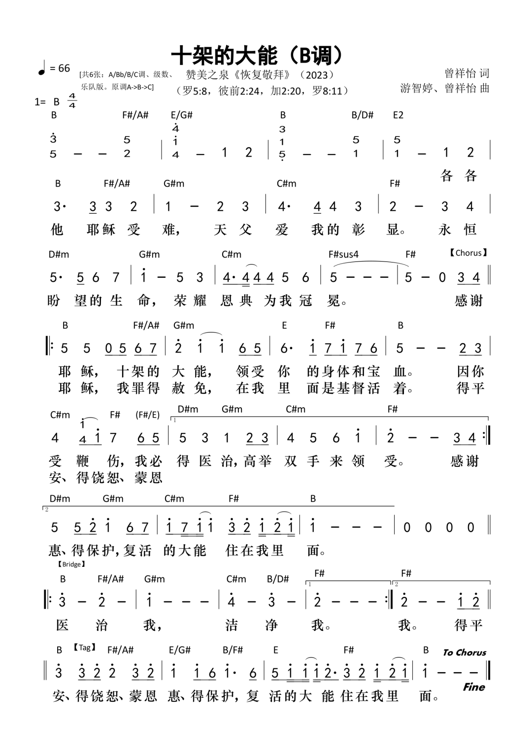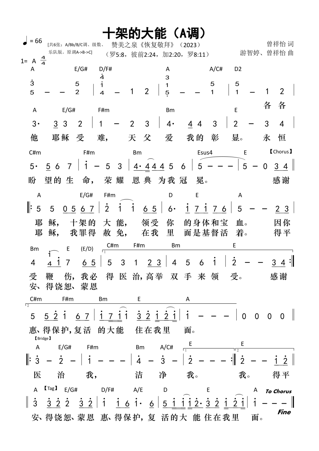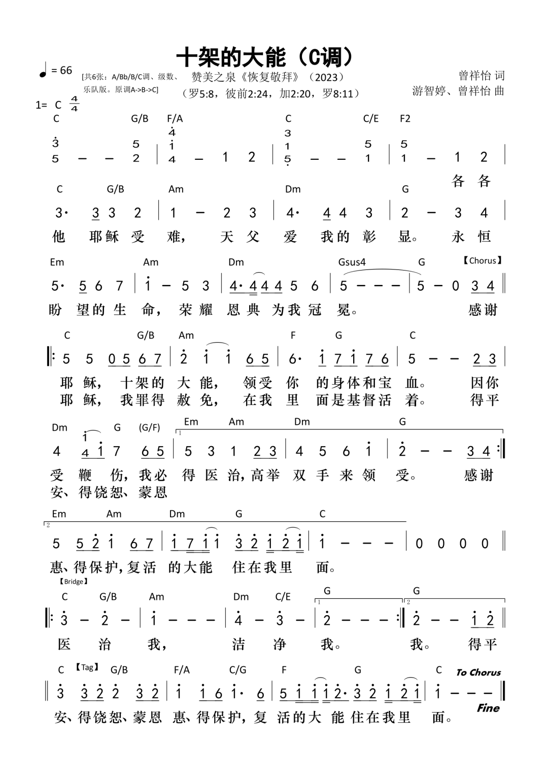十架的大能 The Power Of The Cross 词:曾祥怡 Grace Tseng 曲:游智婷 Sandy Yu, 曾祥怡 Grace Tseng © 2023 Stream of Praise Music / BMI. CCLI #7218299 [Verse] 各各他耶稣受难 天父爱我的彰显 永恒盼望的生命 荣耀恩典为我冠冕 [Chorus] 感谢耶稣 十架的大能 领受你的身体和宝血 因你受鞭伤 我必得医治 高举双手来领受 感谢耶稣 我罪得赦免 在我裡面是基督活著 得平安 得饶恕 蒙恩惠 得保护 复活的大能 住在我裡面 [Bridge] 医治我 洁淨我 医治我 洁淨我 [Tag] 得平安 得饶恕 蒙恩惠 得保护 复活的大能 住在我裡面