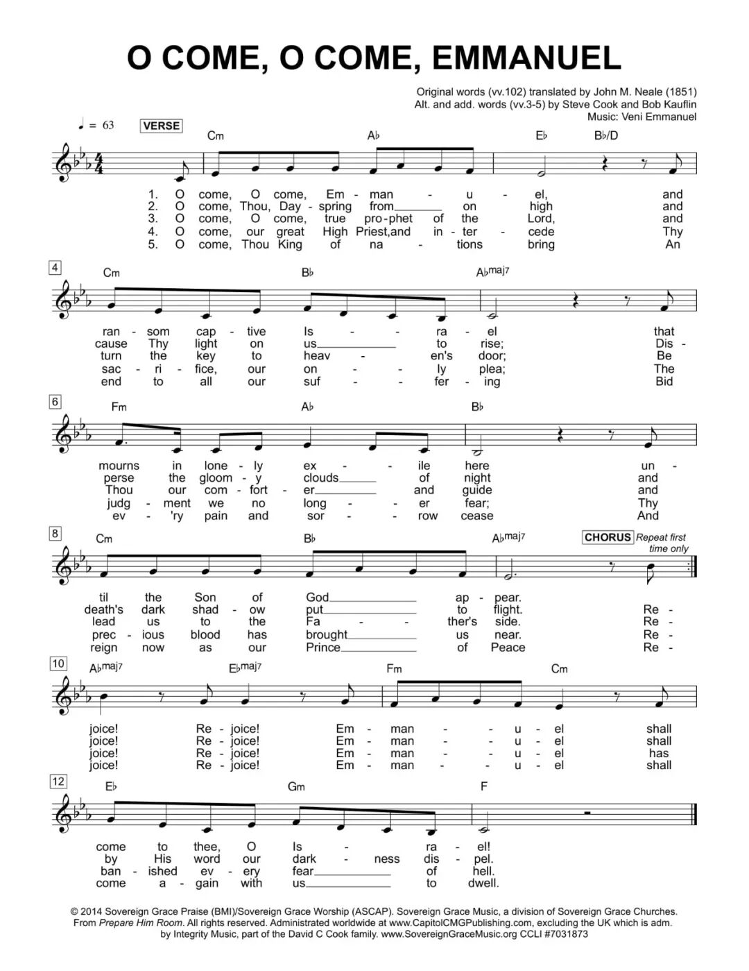 《O come, O come, Emmanuel》 词作者:不详 创作时间最早追溯到11、12世纪 O come, O come, Emmanuel 来吧,来吧,以马内利 And ransom captive Israel 救赎被掳的以色列 That mourns in lonely exile here 他们在此孤独地哀悼 Until the Son of God appear 直到上帝之子出现 Rejoice! Rejoice! Emmanuel 欢喜吧!欢喜吧! Shall come to thee, O Israel 以色列啊,以马内利将临到你 O come, Thou Rod of Jesse 来吧,耶西的杖 free Thine own from Satan's tyranny 将你的子民从撒旦的 From depths of hell Thy people save 暴政中解救出来 And give them victory o'er the grave 让他们胜过坟墓 Rejoice! Rejoice! Emmanuel 欢喜吧!欢喜吧! Shall come to thee, O Israel. 以色列啊,以马内利将临到你 O come, Thou Dayspring, from on high 来吧,明亮的晨光,欢呼你的降临 And cheer us by Thy drawing nigh 使我们的灵魂欢欣鼓舞 Disperse the gloomy clouds of night 驱散夜晚的乌云 And death's dark shadows put to flight 驱散死亡的黑影 Rejoice! Rejoice! Emmanuel 欢喜吧!欢喜吧! Shall come to thee, O Israel. 以色列啊,以马内利将临到你 O come, Thou Key of David, come 来吧,大卫的钥匙,请来 And open wide our heav'nly home 敞开我们天上的家园 Make safe the way that leads on high 使通往高处的道路安全 And close the path to misery 关闭通往苦难的道路 Rejoice! Rejoice! Emmanuel 欢喜吧!欢喜吧! Shall come to thee, O Israel 以色列啊,以马内利将临到你 O come, Adonai, Lord of might 来吧,来吧,万能的主宰 Who to Thy tribes, on Sinai's height 在西奈山上,你曾向你的百姓 In ancient times didst give the law 颁布法律 In cloud and majesty and awe 在云雾、威严和敬畏中 Rejoice! Rejoice! Emmanuel 欢喜吧!欢喜吧! Shall come to thee, O Israel 以色列啊,以马内利必降临你
