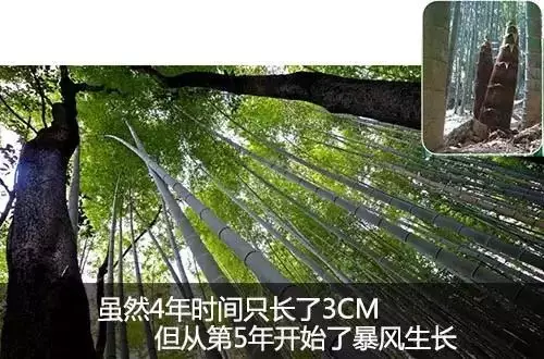 毛竹的前四年,只能长3厘米,而第四年开始暴风般的增长。毛竹的前四年,它在做什么?它的根系深深的扎向大地,生长绵延于周围几百米甚至更宽广的土地,狂风暴雨来临也不至惧怕。