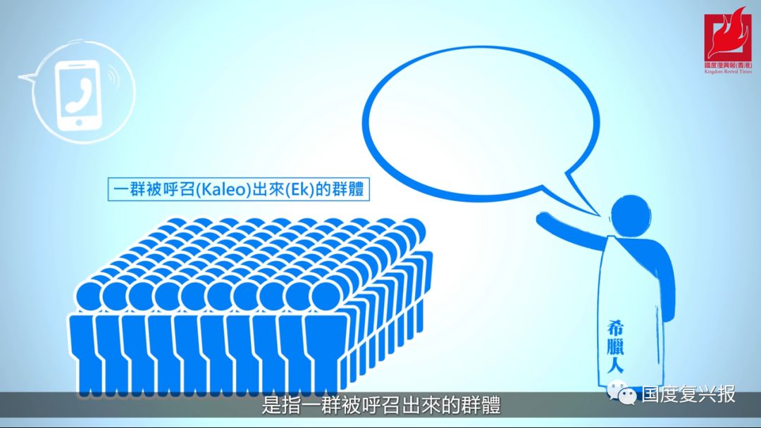 「教会」希腊文「Ekklesia」是由Ek(出来)及kaleo(呼召)组成,是指「一群被呼召出来的群体」。
