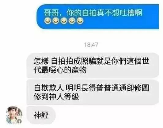 粉丝吐槽他的自拍不行,看语气应该是真爱吧,结果他立马火力大开回击,大骂“恶心”“神经”。