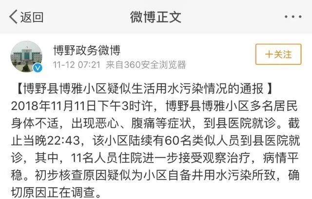 11月12日,河北省保定市博野县官方微博发布通报称,自2018年11月11日下午3时许,该县博雅小区陆续有居民身体不适,出现恶心、腹痛等症状,截止至当晚22:34,陆续又60名类似症状人员到县医院就诊。经初步核查原因,疑似为小区自备井用水污染所致,确切原因正在调查中。
