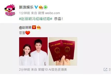 今天一早,赵丽颖和冯绍峰在微博上公布了自己结婚的喜讯。