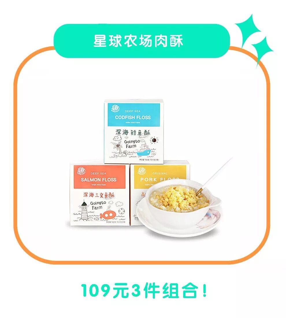 我们对比市面上多款肉酥产品后,发现了这款星球农场的肉酥,里面包含三种不同肉酥——三文鱼酥、鳕鱼酥、猪肉酥。