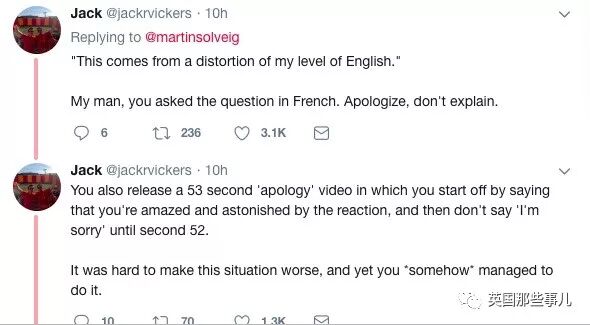 “非常诚恳的向我可能冒犯到的人道歉!可能是我英语不好造成了误解(他当时是用法语问的),
