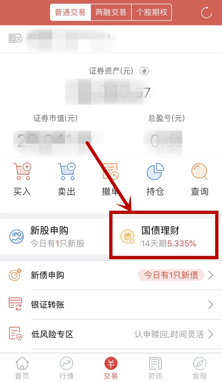 点击菜单栏“交易”——“国债理财”