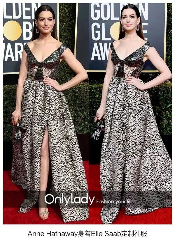 Anne Hathaway身穿Elie Saab定制豹纹礼服亮相。