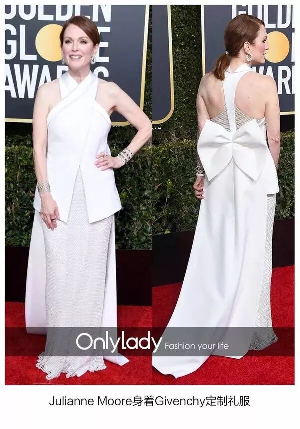 还有58岁依旧少女心的Julianne moore,一袭Givenchy紀梵希白色礼服裙,礼服后面的蝴蝶结超可爱!