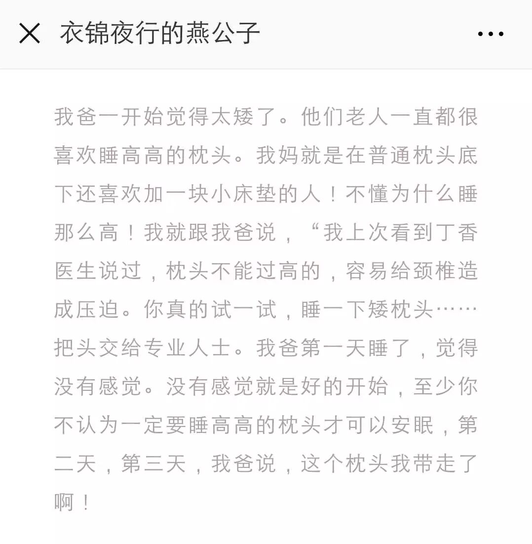 微博大V“衣锦夜行的燕公子”是对枕头要求非常苛刻的人,她曾睡遍国内外各种材质的枕头,都没能找到自己的“真命天枕”,而睡过菠萝斑马美肤枕之后,不仅征服了公子本人,连习惯睡高枕的爸爸都说:“这个枕头我带走了啊!”