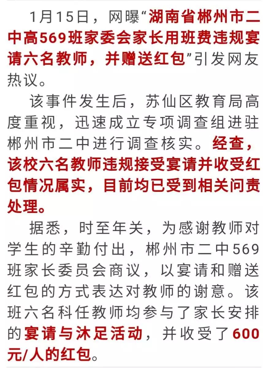 对此,苏仙区教育局根据《中小学教师违反职业道德行为处理办法(2018年修订)》第三条和《关于对违反群众工作纪律和干部作风要求进行问责的暂行办法》【湘组发(2013)10号)】第八条第(一)、第(二)款规定,责成郴州市二中对六名教师作出如下处理:勒令6名涉事教师退还接受请吃、沐足活动和收受红包所产生的费用合计6471元(已全部退还到位),给予诫勉谈话问责处理,并取消当年评先评优资格,免去何姓教师569班班主任职务。