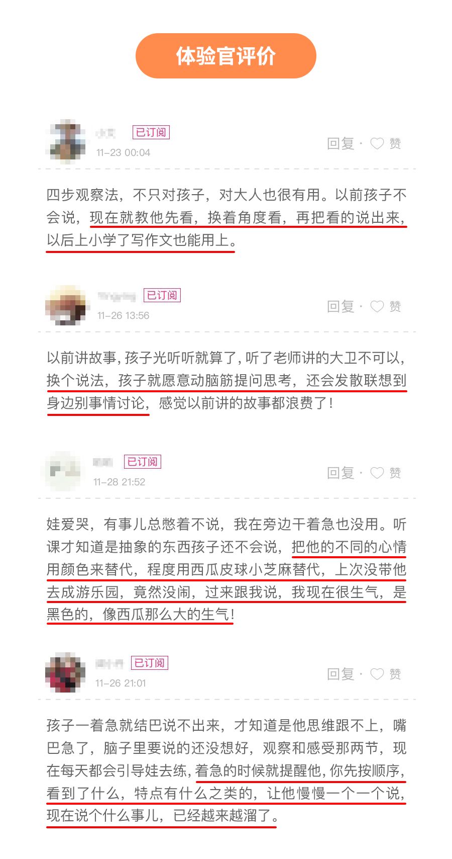 体验过课程后,不少妈妈都感慨:原来错过了那么多可以和孩子对话的场景。以前是因为不知道,所以没有意识去做,现在听了杨老师的课,按照老师的方法,特别容易上手。