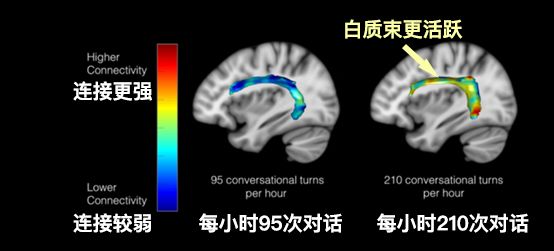(每小时亲子对话95次和210次相比,前者孩子的大脑白质束活跃度明显低于后者)