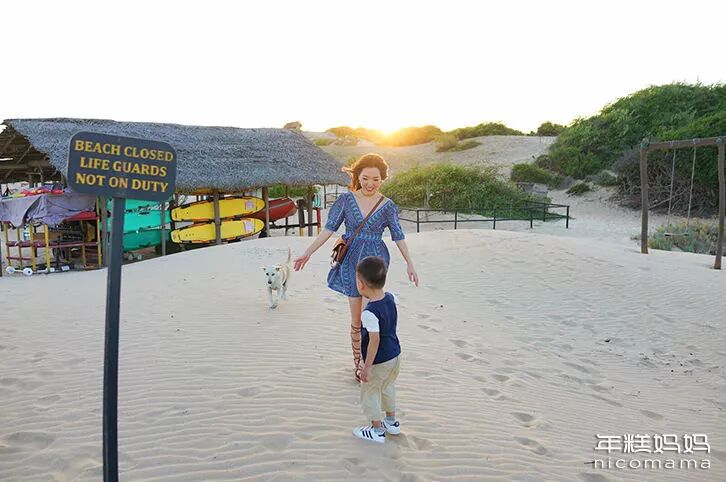 私家海滩沙子很细,夕阳暖暖,几乎没人。只有我们,和狗。