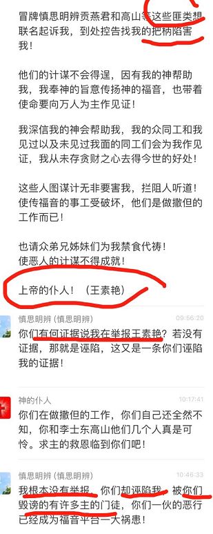 记得有一次,王姊妹发出了一段信息,提到慎思明辨和高山等人联名起诉你,请求弟兄姊妹为你禁食代祷,使恶人的计谋不得成就。但慎思明辩本人与另一位拥护王姊妹的弟兄交流时,慎思明辩曾指出这是无中生有的诬告。但那位转发王姊妹代祷信息的弟兄当时根本并没有理性的对话,反而骂慎思明辩在作撒但的工作。
